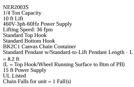 Harrington 1/4 Ton Electric Hoist 36 fpm, 10'Lift