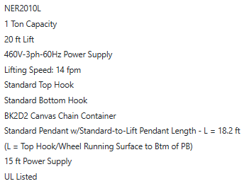 Harrington, 1 Ton Electric Hoist, 3 Phase, 14 fpm, 20' Lift, Hook Mounted